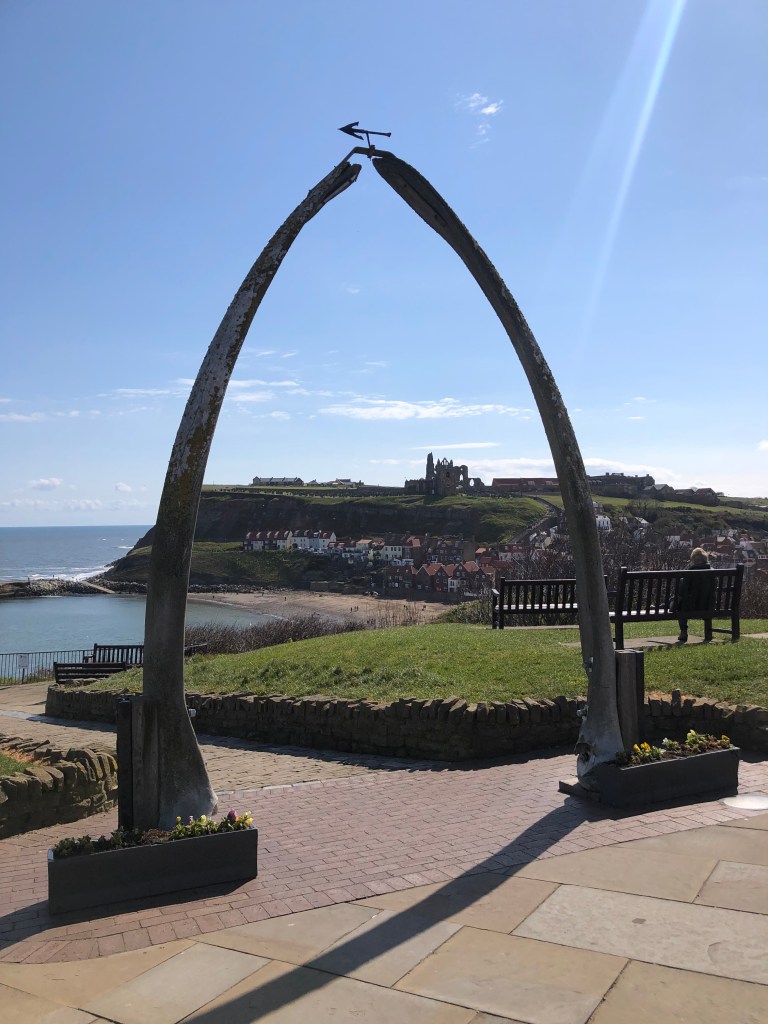 To our right the cliff tapers down into the bay, and so we head for steep stone steps that are straddled by an unusual-looking arch. A replica of a whale’s jawbone, the original (and real) jawbone arch was erected In 1853, as a nod to the town’s successful whaling history. Just to the left of the arch is a statue of Captain Cook – famed for his voyages to Australia and New Zealand – who learned his seafaring skills right here in Whitby.